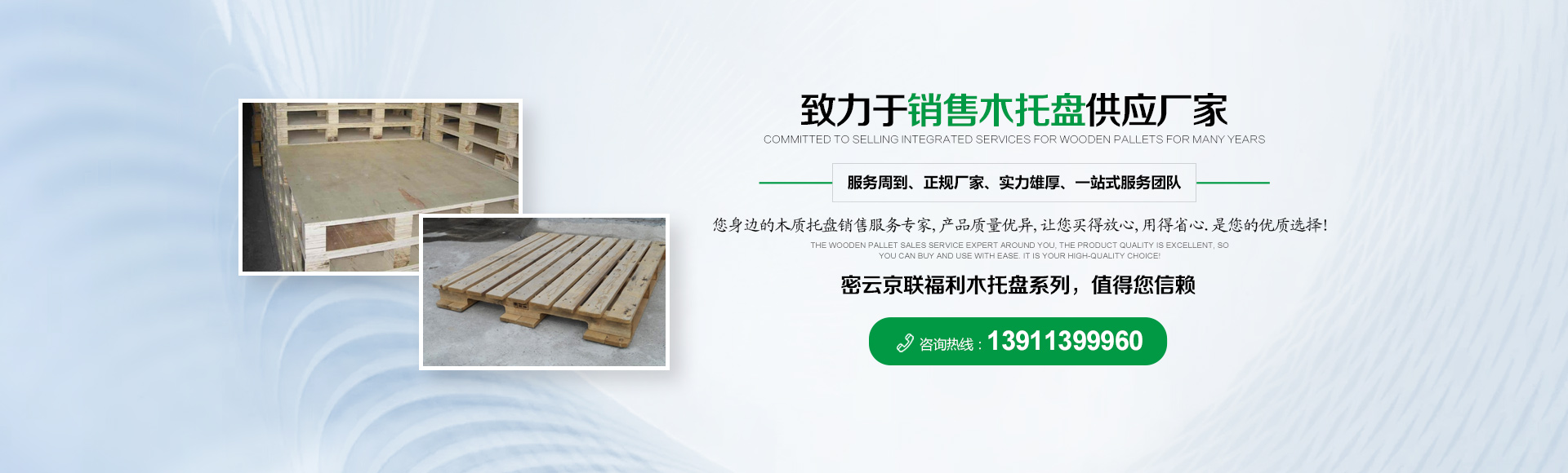 北京京聯國順木制品有限公司 (原北京市密云縣京聯福利木制品廠)成立于1993年,位于北京市密云縣西田各莊鎮蒼頭村,占地約5000平米。我公司工廠是一家大規模以銷售木托盤為主的生產廠家。本工廠是一家直接采購原木,按客戶要求生產規格尺寸的托盤,我公司工廠位于河北省承德市有著木材加工點,可以做到,從山上的木頭下山到客戶手中的托盤都是一手貨,減少了中間商的費用,所以我公司售出的產品對北京這個龐大的市場來說在同樣的規格尺寸的托盤來說價格比較占優勢。